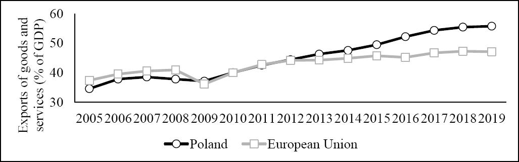 Poland’s and EU’s exports of goods and services (% of GDP) 2005–2019. Source: Own work based on data from the World Bank [2020].