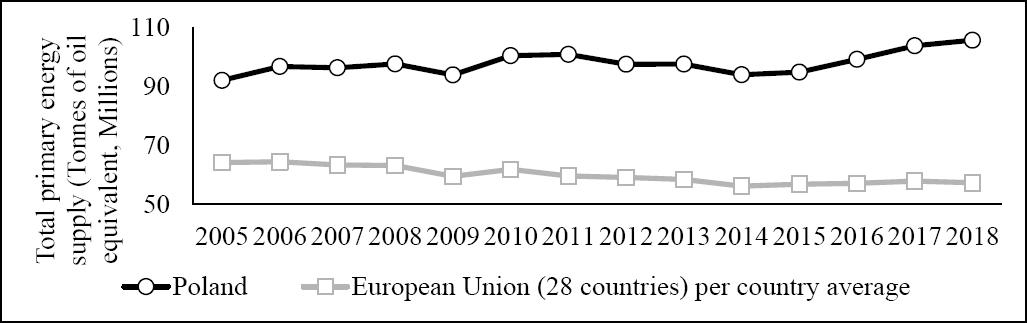 Poland’s and EU’s total primary energy supply (tons of oil equivalent, millions) 2005–2018. Source: Own work based on data from the OECD [2020].