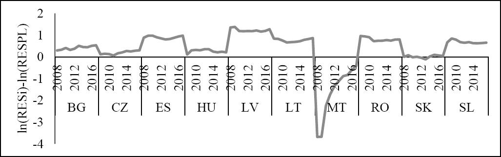 Comparing values for Poland with the RCA* values of other countries (ln(RCĄ.) -ln(RCAPL); Figure 6), the studied economies can be divided into three groups. The first group is comprised of countries that had a constantly lower international competitiveness than Poland (Bulgaria and Latvia); the second, of economies with a falling relative international competitiveness (Estonia and Lithuania); and the third, of economies that constantly displayed higher international competitiveness than Poland (Czechia, Hungary, Slovakia, Slovenia, and Malta – with 2013 being an exception).