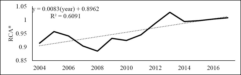 The international competitiveness of Poland between 2004 and 2017 exhibited a positive trend (Figure 5). Following an initial increase in international competitiveness after joining the EU, Polish RCA* fell from 2005 (0.941) to 2008 (0.885), increasing later until 2013 (1.028). Interestingly, Poland’s international competitiveness registered its greatest gains during the 2008 financial crisis and its aftermath. This can be related to the fact that Poland wasn’t significantly impacted by the said crisis and to a relatively quick recovery of the German economy, which is the biggest recipient of Poland’s exports.