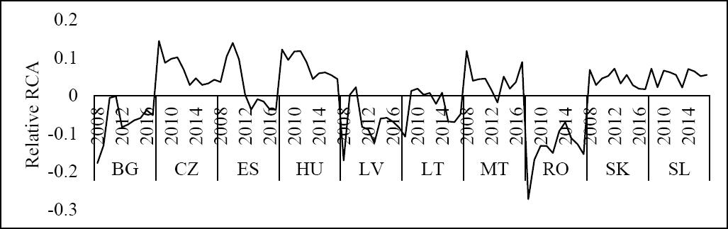 Relative RCA* for the analyzed economies. BG, Bulgaria; CZ, Czechia; ES, Estonia; HU, Hungary; LT, Lithuania; LV, Latvia; MT, Malta; RO, Romania; SK, Slovakia; SL, Slovenia.