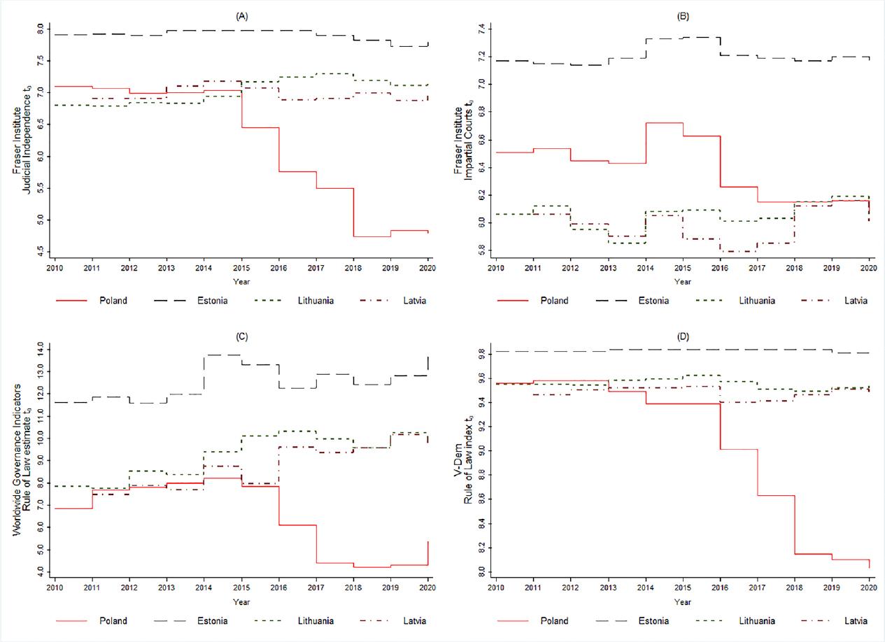 Rule-of-law proxies for selected countries (Poland and the three Baltic States). (A) Fraser Institute Judicial independence; (B) Fraser Institute Impartial courts; (C) Worldwide Governance Indicators Rule-of-law estimate; and (D) V-Dem Rule-of-law Index.