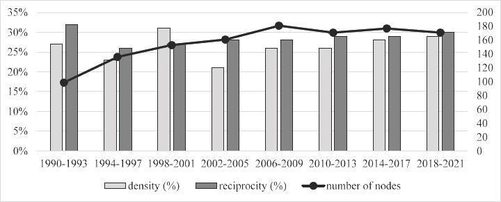 Figure 2 summarizes the overall results of the CBM&A network analysis between 1990 and 2021. Compared to the results of the study by Galaso and Sánchez-Díez [2020, p. 38] and Dueñas et al. [2017, p. 4], the analyzed network (despite its directional character) was characterized by a relatively high density (on average, about 26%) in the entire analyzed period, recording the highest level between 1998 and 2001. It means that between 1990 and 2021, the global CBM&A network was, on average, approximately 26% complete.