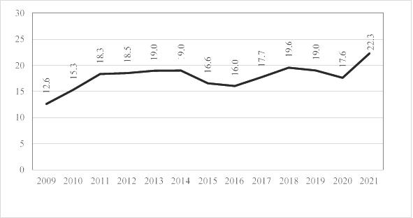 A greater number of technical or sanitary restrictions (especially STCs) introduced by the WTO countries in trade, which were discussed earlier, did not determine the increase in the degree of restrictiveness in world trade. As mentioned, the number of new ones introduced in 2020–2021 was generally small compared to the situation in 1995–2017. However, when analyzing the WTO data (Figure 5), it can be seen that despite a relatively small number of new nontariff restrictions, there was a very clear increase in the percentage of world trade covered by various types of import restrictions in 2020. Since 2009, this share has been growing but at a relatively slow pace. Until 2017, it did not exceed 5% of the value of world trade. A sharp increase could be noticed first in 2018 (7.5% compared to 4.7% in 2017), and then in 2020, when import restrictions already covered 13.6% of the value of global trade. In 2021, this percentage decreased to 8.7%, i.e., to the 2019 level.