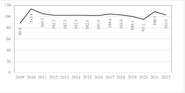 Volume of world exports in the years 2009–2022 (previous year = 100).