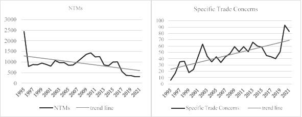 Since 1995, i.e., following the end of the Uruguay Round of the GATT, the number of newly introduced nontariff measures has shown a downward trend (indicated by the trend line in Figure 3 on the left) in the subsequent years. In 2020, WTO countries introduced 306 “regular” new restrictions, i.e., the smallest number since 1995. In return, the number of measures that were not previously notified, i.e., sanitary, phytosanitary (SPS specific trade concerns), and technical restrictions, has increased (TBT specific trade concerns) (trend line on the right side of Figure 3). The number of these additional new barriers was the highest in 2020 since 1995 (93) and slightly lower in 2021 (83). Compared to 2019 (prepandemic period), WTO countries introduced as much as 83% more of such measures in 2020.