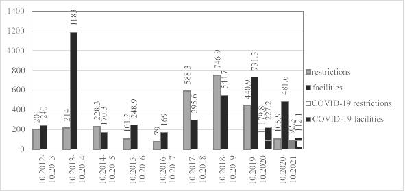 Between October 2019 and October 2021, the WTO members also introduced “regular” trade regulations (both those facilitating and hindering trade). The word “regular” refers to regulations unrelated to the COVID-19 pandemic. Trade affected by such restrictive measures fell from US$746.9 billion to US$440.9 billion, while facilitated trade increased from US$544.7 billion to US$731.3 billion. The reasons for the decline in trade affected by the restrictions were: the general decline in trade and the concentration of the governments of individual countries on fighting the pandemic. In 2021, the turnover covered by the postpandemic restrictions was lower than in 2020 because its value amounted to approximately US$106 billion, while trade covered by facilitations other than those related to COVID-19 reached the value of approximately US$480 billion.