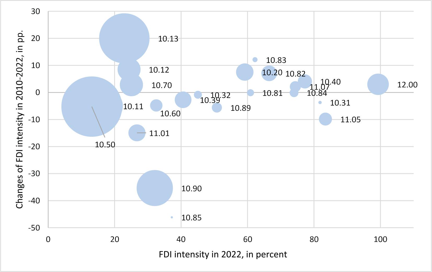 The FDI intensity in the food industry. Remarks: FDI intensity means the share of enterprises with foreign capital in net revenues from the sale of products, goods, and materials. The size of a bubble reflects the share in the food industry. PCA code description in Table 1.
