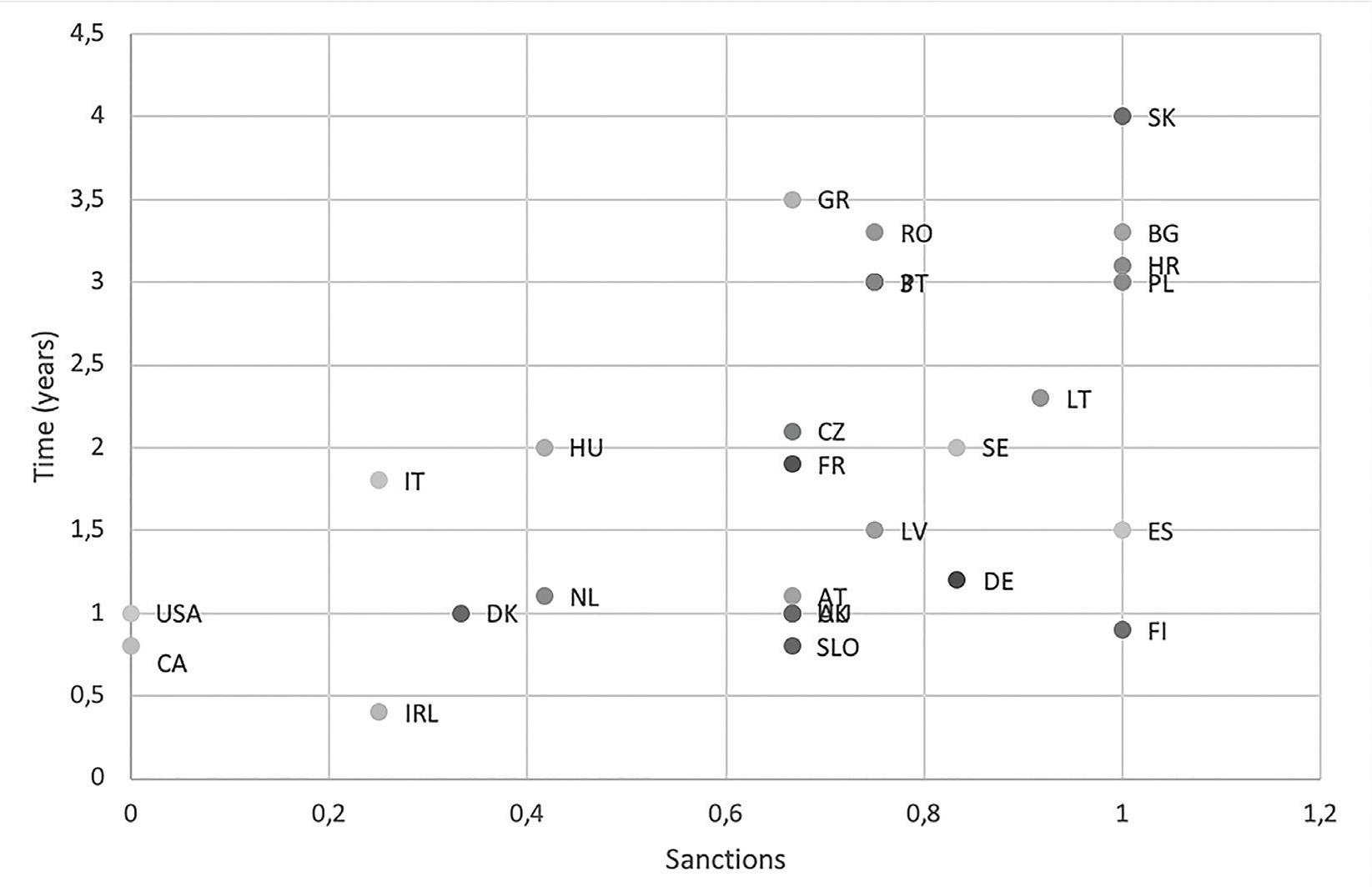 The relationship between Time and Sanctions for the countries under study.