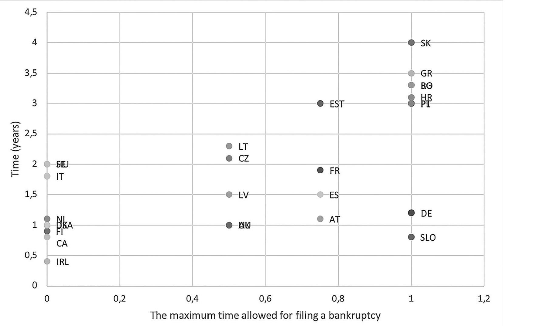 The relationship between Time and The maximum time allowed for filing bankruptcy petitions for the countries under study.