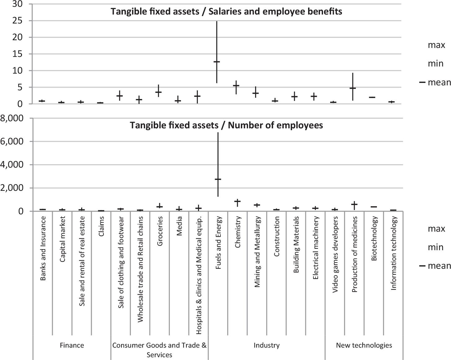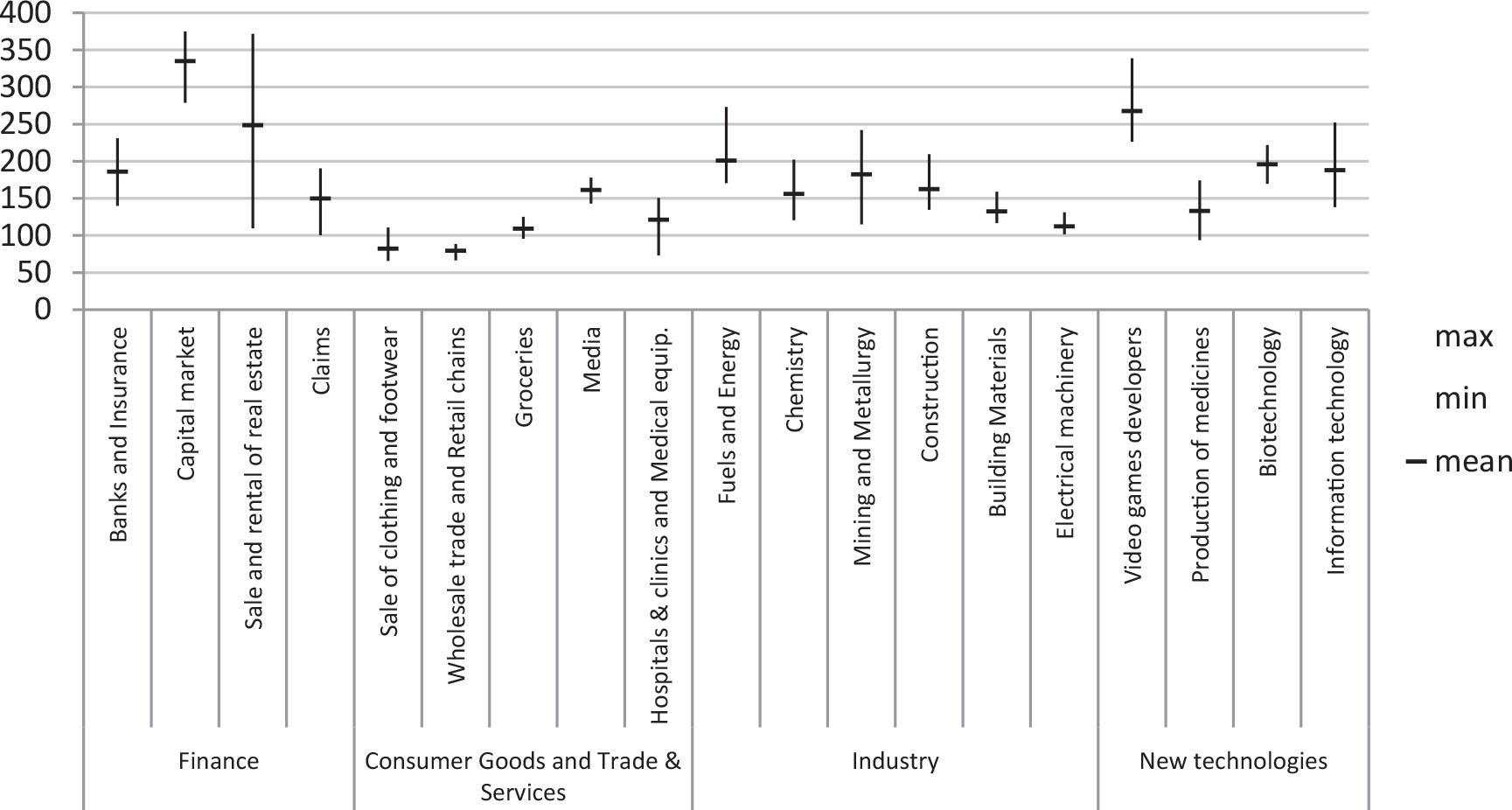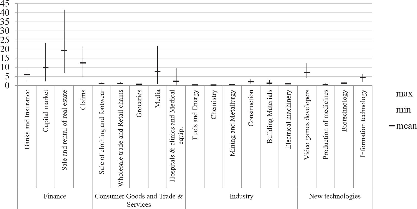 The situation of companies from individual industries in terms of the above indicators is presented in the form of charts, including arithmetic averages and their range of variability from the lowest readings (min) to the highest (max).