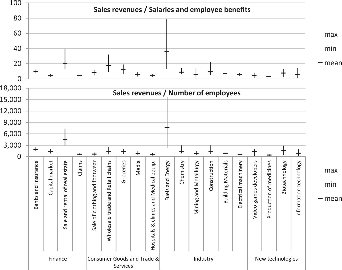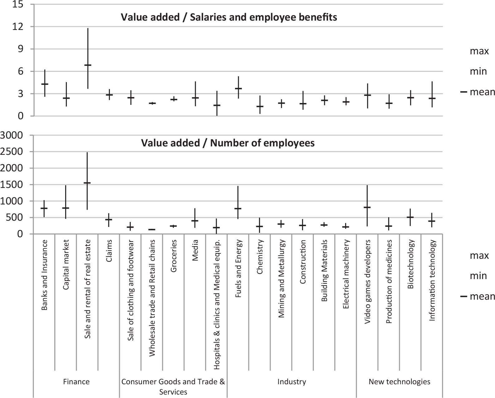 Of the seven industries with the highest salaries and benefits per employee, six are also among the seven industries with the highest Value added to Number of employees indicator (the exception is “IT”), and four with the highest Value added to Salaries and employee benefits indicator (“Sale and rental of real estate.” “Banks and insurance,” “Fuels and energy,” and “Video games developers”). The industries with the lowest level in terms of both labor and human capital efficiency indicators considered included “Wholesale trade and retail chains,” “Hospitals, clinics and medical equipment,” “Chemistry,” and “Production of medicines.” At the same time, it should be noted that relatively larger ranges characterize industries with higher values of human capital efficiency indicators. Regarding remuneration and employee benefits per employee, the largest ranges in labor productivity indicators, based on value added, occurred in the “Finance” sector. Significant differences also characterize the “New technologies” and “Industry” sectors (mainly due to the “Fuels and energy” industry).