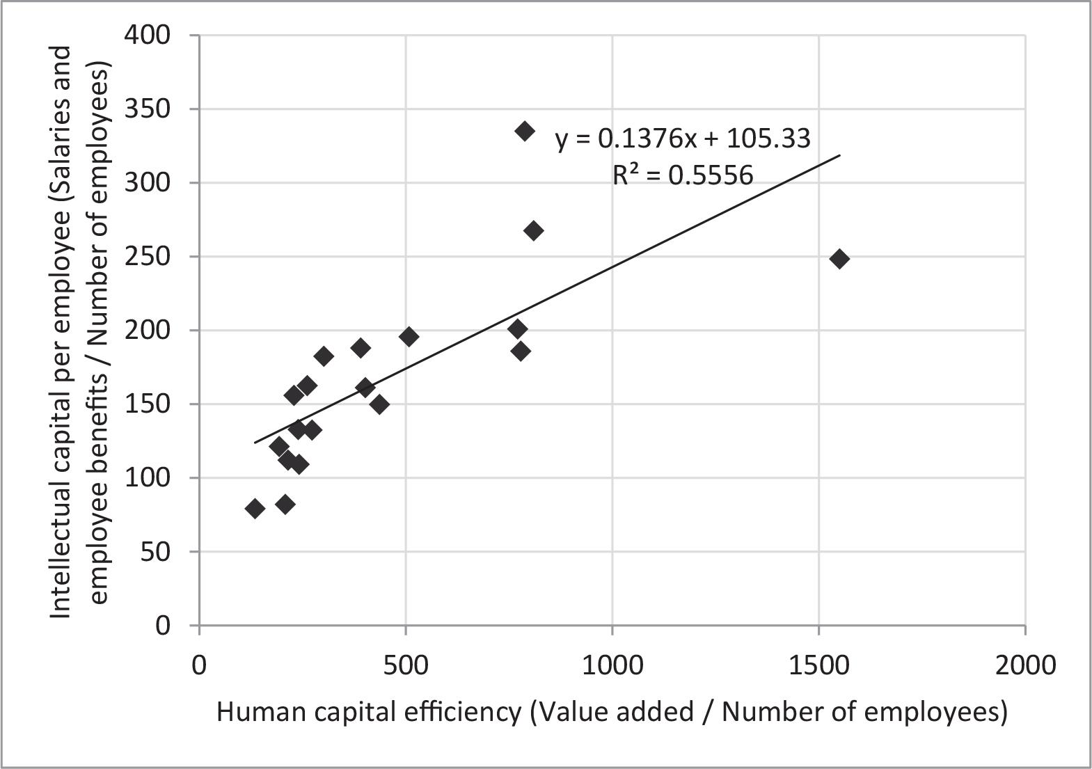 For the article, the quotient of added value, generated by the company and its human capital (identified with total wages and benefits of employees), was adopted as a representation of the efficiency of human capital, according to Pulic [Pulic, 1998]. Pulic emphasizes that value added is an objective indicator of business success and the coefficient shows the actual productivity of the company’s staff (the value that the company obtains from investing one monetary unit in its staff) [Pulic, 2000, 2004].