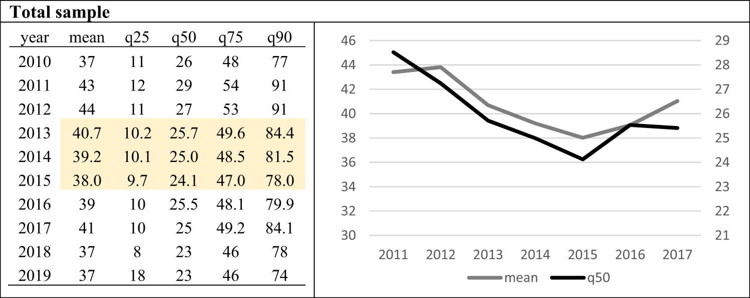 Figure 1 shows the DPO’s mean, median, and other descriptive statistics for the whole sample of Polish entities in the following years. Figure 1 suggests that the regulations in force between 2013 and 2015 shortened the DPO in each analysed quantile. Different factors could impact the observed changes, but the shorter DPO should not be treated as the result of the changes in the statutory interest rates. In Poland, from May 2012 to December 2015, creditors could charge debtors for late payments at a systematically declining (from 14.5 to 8%) interest rate.