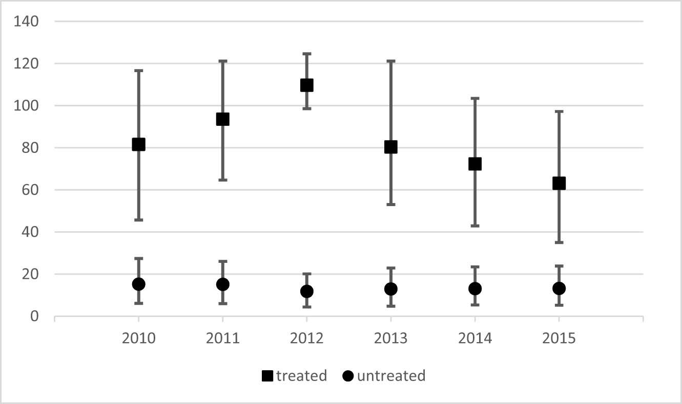 Figure 2 shows the median DPO in 2010–2015 by treated and untreated groups. The treated group includes those companies that had DPO between 90 and 150 days in 2012, i.e., those affected by the regulations that were in effect in 2013–2015. The chart also includes ranges covering two quartiles around the median. The graph shows that in 2010–2012 the average treated company extended DPO. However, the length of DPO for the 3rd quartile in those years is similar. The size of the median DPO had been declining markedly since the regulations under analysis took effect. The control group consists of companies with a DPO of less than 30 days in 2012. These companies were not affected by the analysed rules. The chart shows that this group includes reliable contractors who generally do not have long and overdue payments, regardless of whether the regulations under discussion were in effect.