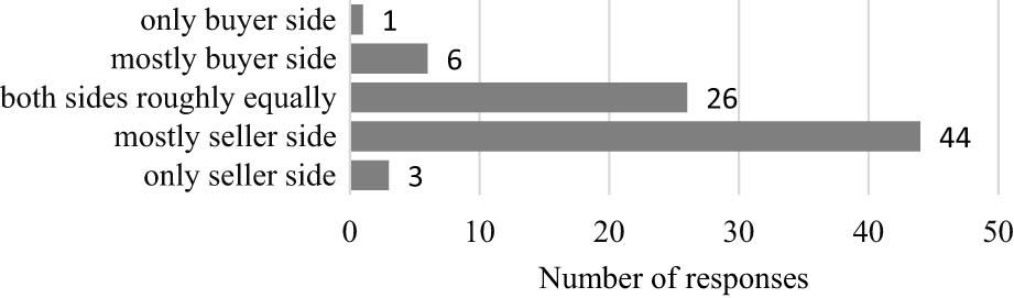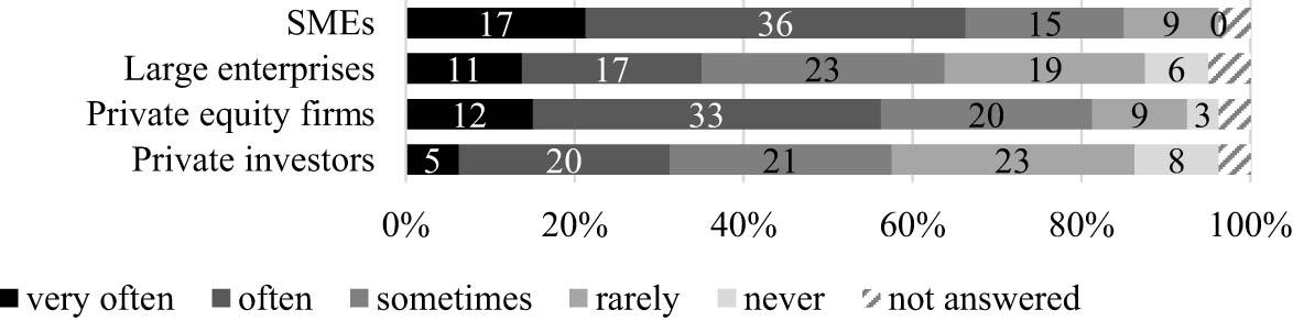 Similarly, we searched for differences in perceptions of selling motives among advisors in three groups, supporting: the buyer side (only or mostly), the seller side (only or mostly), and both sides roughly equally. On the basis of the Kruskal–Wallis test, we found no statistically significant differences in the perceptions of the analysed selling motives, except for the motive of reorientation of the owners (p-value = 0.018). Almost all advisors supporting the buyer side (except one respondent) indicated that reorientation of the owners is the motive that appears “often.” So, they perceived this motive as more important than advisors in other groups.