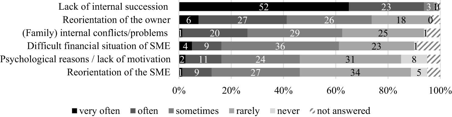 On the basis of the literature and empirical study, we determined the prevalent motives for selling SME. We then asked advisors to rate the frequency of observed options (Figure 4). According to 93.8% of advisors, the lack of internal succession was the typical reason (65.0% of respondents indicated “very often” and 28.8% “often”). The second important reason was the reorientation of the owner, which was suggested by 37.5% of answers marked as “very often” or “often.” The other motives were internal conflicts, family problems, and the problematic financial situation of an SME. Psychological motives, including lack of motivation and reorientation of SME, were rated as rare or never-occurring motives by 48.8% of the advisors.