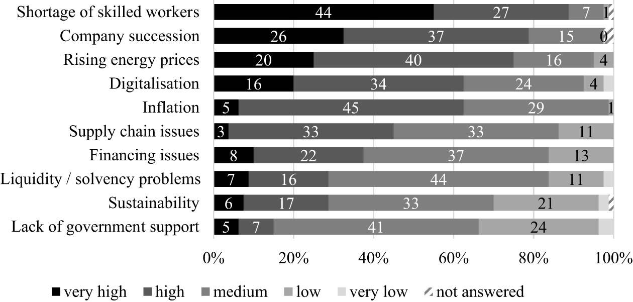 The other challenges were related to financial considerations, like rising energy prices (75.0%), inflation (62.5%), and digitalisation (62.5%). A “medium” relevance was the most frequently indicated answer for supply chain issues, other financing issues, liquidity/solvency problems, sustainability, and the lack of government support.
