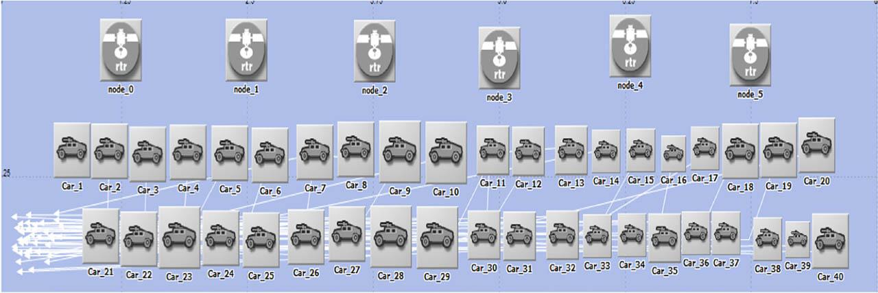 Nodes are randomly installed in a 9,000 × 1,000 m region to determine the VANET routing protocol phase. RIVERBED, a network simulator, is used for simulations. A transceiver is installed in each node. Radio waves with a broadcast range of 250 m are used to communicate between nodes. Vehicles will be considered as the moving nodes with varied speeds. 2 Mbps is the used bandwidth of the channel. Table 1 shows the simulation parameters utilized in the simulation.