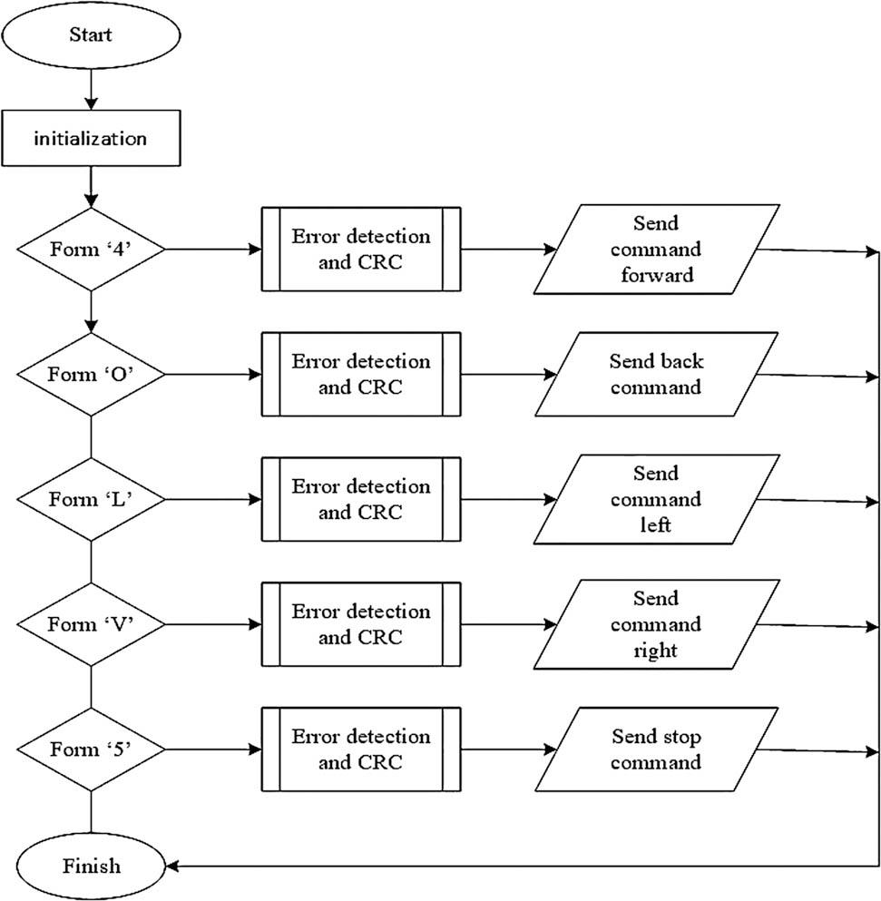 The whole series of flowchart from the glove system as an electric wheelchair controller can be seen in Figure 7. These flowcharts are described the error detection and Cyclic Redundancy Cheek (CRC) calculation in electric wheelchairs automated using smart glove All instructions (Figure 8) are included onward (4), backward (O), left (L), right (V), and (5). when the system is ON, the first time the hand will bend its fingers according to the command codes that were previously set, then the system will match those curves whether they match the codes that have been set in the program. If not, the system does not respond and an experiment occurs. repeat on the curve of the fingers. If appropriate, the data coming from the system will be sent by the nRF24L01 module. If the electric wheelchair can respond, it means that the data from the system has been sent. If not, then back to the experiment of inputting command codes via finger.