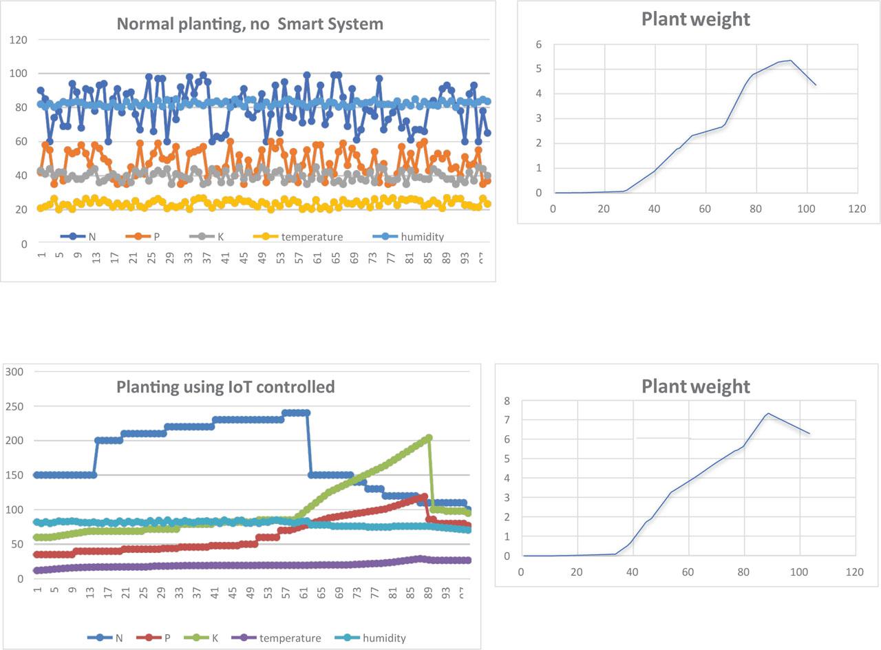 Figure 9 shows two experimental plantings of tomatoes in two different containers in the same greenhouse conditions. In the first experiment we planted tomatoes using a traditional planting method: this method adds nutrients according to best-practice manual experience, which is adding nutrition as needed. The result – production of green and fruits – is up to 5.6 kg. The second part of Figure 9 shows planting tomatoes using controlled addition of nutrition based on each stage of growth. We found that with IoT controlled NPK addition, production will reach 7.4 kg, which exceeds the first, traditional, method by 2 kg. We can do more readings and experiments, playing with all variables, keeping records in our big data repository, until we define the very optimum production of greenhouse tomato cultivation.