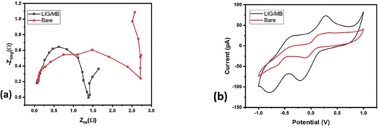 (a) EIS of bare LIG and LIG/MB, (b) Comparative CV response of LIG and LIG/MB with the potassium ferricyanide–KCl solution for 50 mV/S, n = 4 (number of cycle). CV, cyclic voltammetry; EIS, electrochemical impedance spectroscopy; LIG, laser-induced graphene; MB, methylene blue.