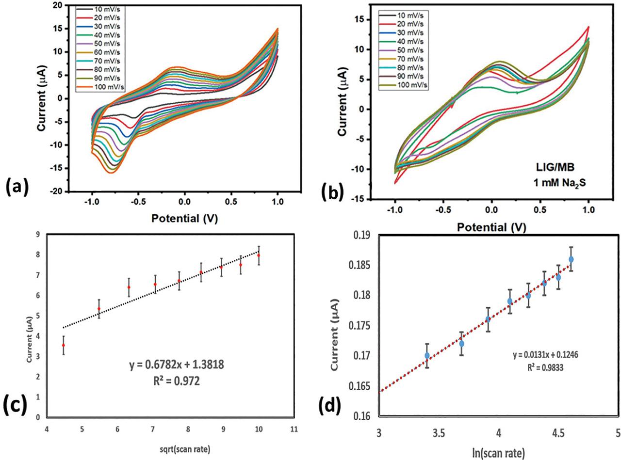 The scan rate analysis verified that the modification done using MB was successful, as the peak pertaining to MB was observed in the PBS due to electrochemical uptake. For this analysis, a buffer solution of 0.1 M PBS (pH = 7.4) was taken, and the scan rate was changed between 10 mV/s and 100 mV/s. As shown in Figure 5(a), a clear peak of MB has been observed. Further, the effect of varying scan rates over the electrocatalytic oxidation of LIG/MB over 1 mM Na2S was tested, as depicted in Figure 5(b) [34, 35].