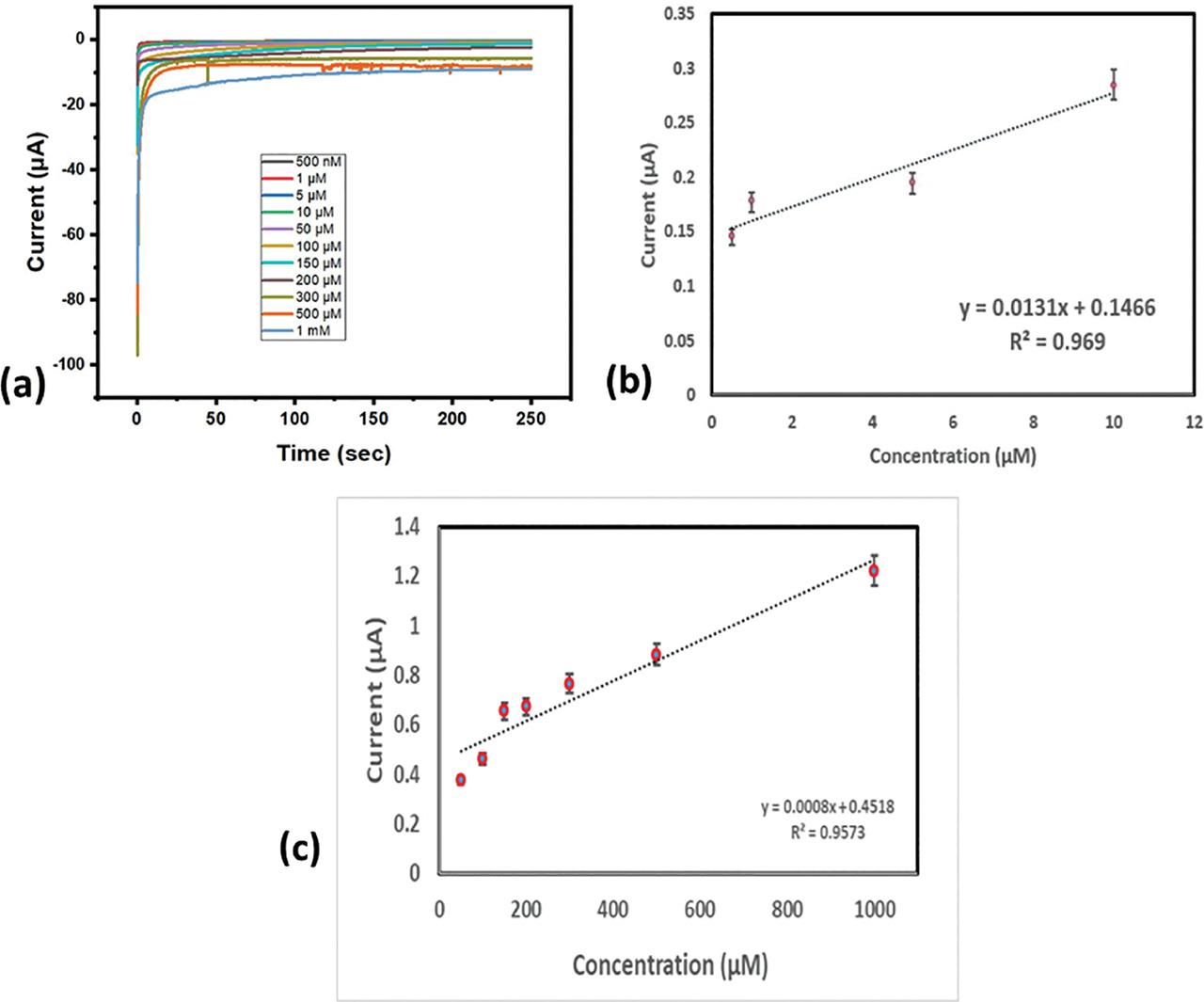 There were two linear ranges observed from the calibration curve of the current vs. concentration, 0.5–50 μM and 100 μM–1 mM, and their respective linear equations are as follow: