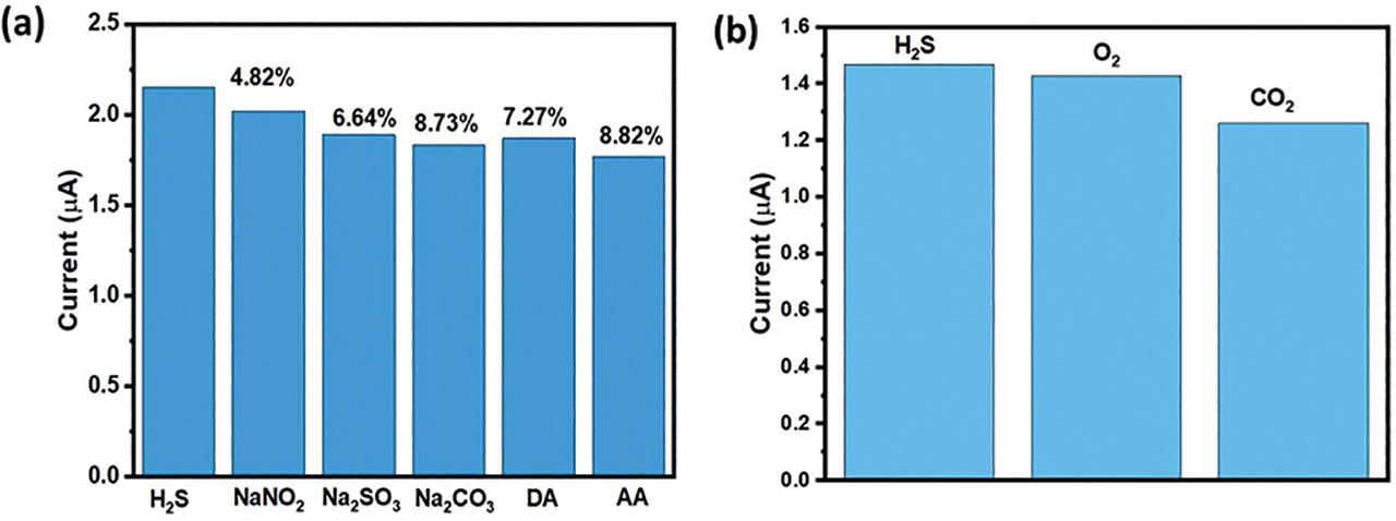 Interference tests have been performed to determine the electrochemical sensor's selectivity. For this, various interfering analytes such as NaNO2, Na2SO3, Na2CO3, DA, and AA with 100 μM concentration were taken and mixed in 5 μM concentration of Na2S predissolved in 0.1 M PBS (pH = 7.4). In addition, O2 and CO2 were purged in the Na2S solution for 10 min to vary the effect of gases. It can be seen that there was no significant interference of the various analytes mentioned above, and the sensor shows good selectivity. The current change mentioned in percentage at the top of the bar graph and the result of the interference study are displayed in Figure 8