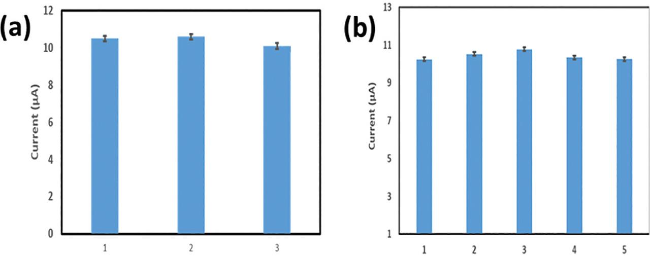 (a) Repeatability and (b) reproducibility of the fabricated electrochemical.