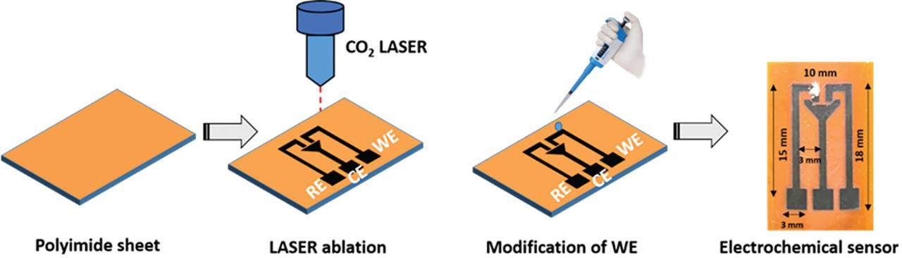 The sensor was designed in computer aided design (CAD) software and converted to the .dxf file format, which was in turn converted to the .cdr file format. Further, it was processed using Coral draw compatible with the software of the CO2 laser system, which was used for the laser ablation process. For fabrication, a polyimide sheet was used, and the laser ablation process was done with a power of 6.5% of 30 W and a laser speed of 4.5% of 1200 mm/s. The sensor was fabricated after the laser ablation, as in Scheme I.