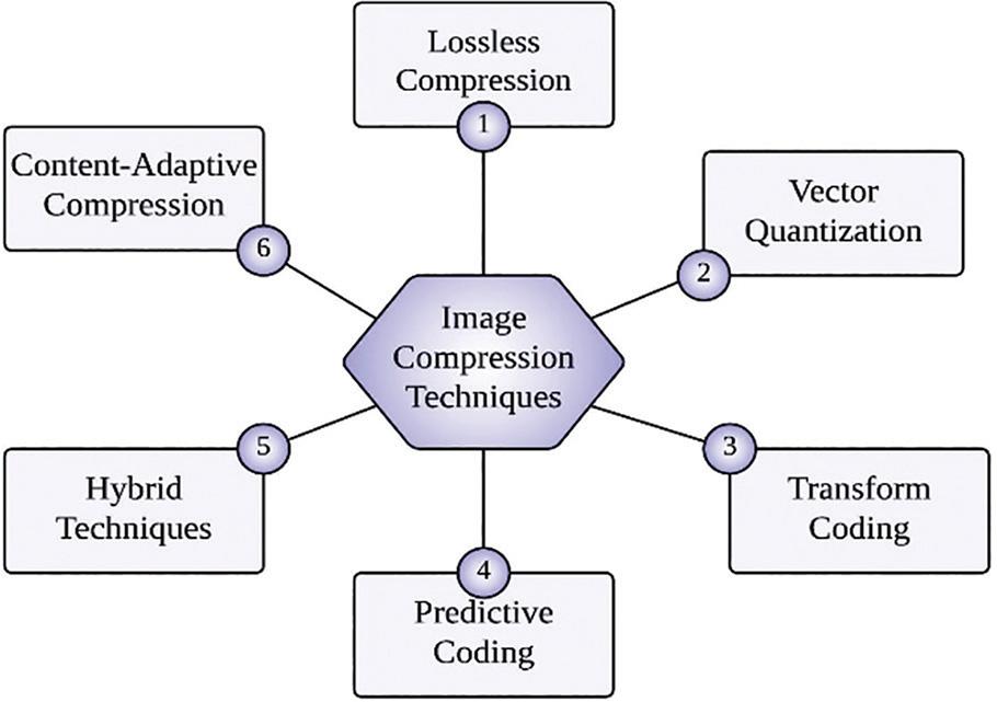 The utilization of image compression techniques is of great significance in the process of lowering the file size of digital photos, with the primary objective of preserving the visual quality of the image. Images play a crucial role in a multitude of applications by facilitating efficient storage, transport, and sharing processes [1,2,3,4]. Some prominent image compression techniques, as depicted in Figure 1, are explained as follows: