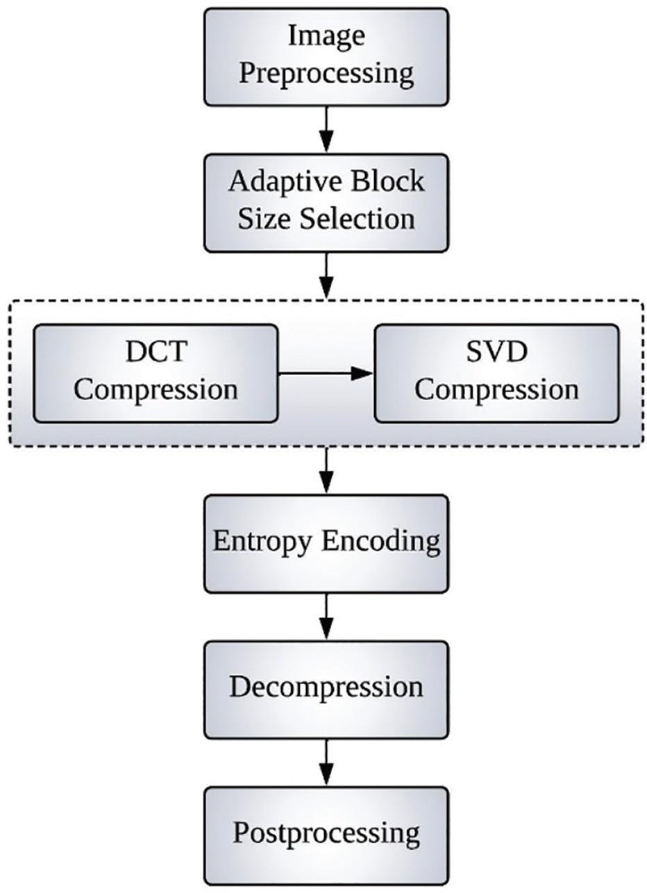 The novel methodology employed for the hybrid image compression algorithm uses the DCT-SVD technique, along with an adaptive block size selection strategy, consisting of multiple stages. The primary objective of this comprehensive technique is to achieve optimal compression efficiency while simultaneously maintaining the integrity of image quality. The adopted methodology of the proposed hybrid algorithm is depicted in Figure 2 and explained in the following paragraph. The key steps of the adopted methodology are image preprocessing, adaptive block size selection, DCT compression, SVD compression, entropy encoding, decompression, and postprocessing.