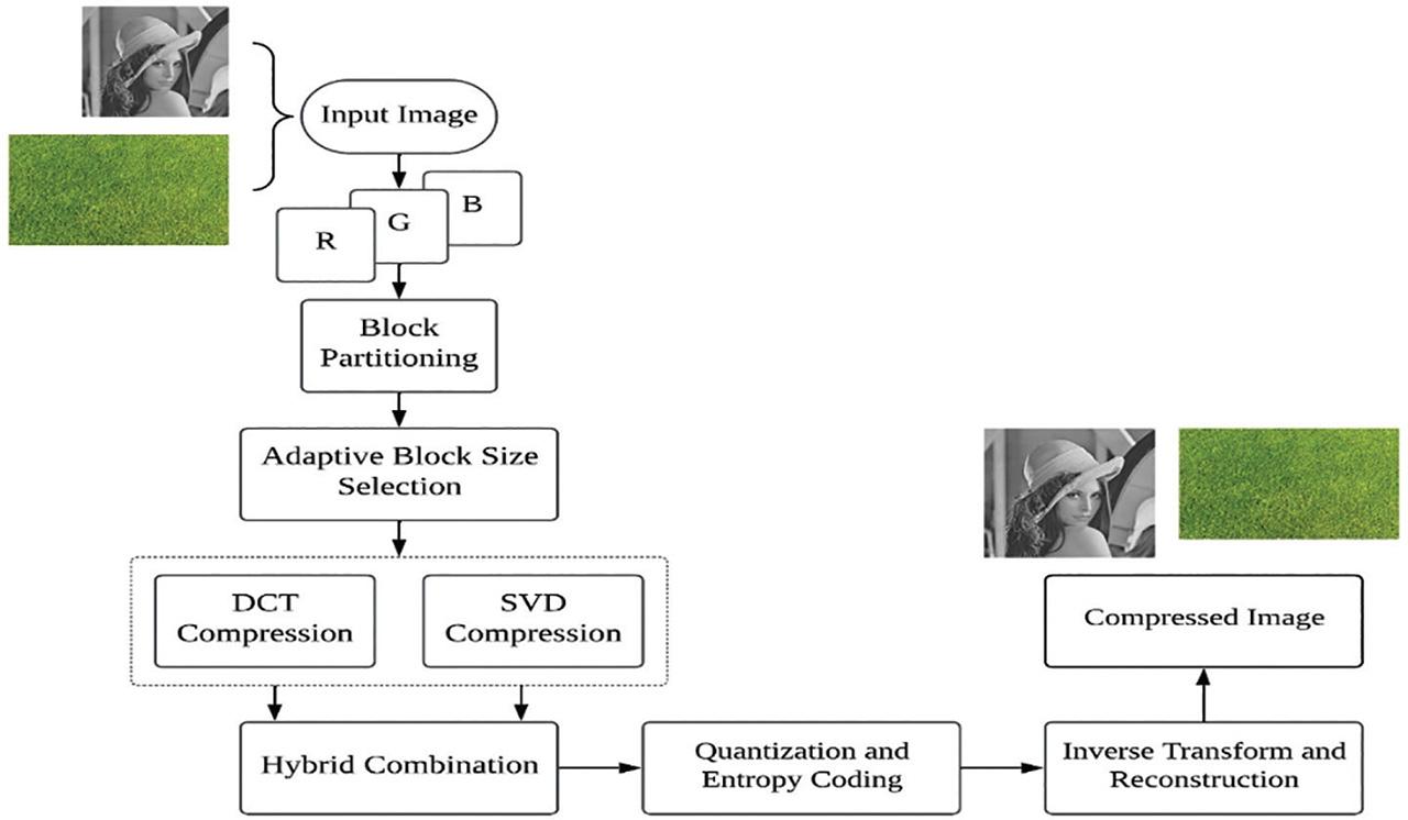 The rationale behind the development of this approach is also derived from practical implementations in real-world scenarios. Efficient image compression is crucial in several fields, including medical imaging, remote sensing, and multimedia communication, as it serves to minimize storage requirements and transmission bandwidth. The hybrid technique presented in this study aims to enhance compression efficiency and maintain picture quality by employing adaptive block size selection and a synergistic combination of the DCT and SVD. The motivation for this study stems from the possibility of achieving significant compression ratios while maintaining image quality at a level that is imperceptible to human observers. Moreover, the escalating need for real-time image processing necessitates the use of algorithms that exhibit swift execution speeds. The motivation for this hybrid approach also stems from its ability to offer effective compression for applications that necessitate real-time processing [8]. Furthermore, this study stems from the desire to push the boundaries of image compression through the development of a hybrid algorithm that effectively combines conventional approaches with the intricacies of modern images. This study aims to design an algorithm that achieves both high compression ratios and adaptive picture content while also providing real-time efficiency. This approach holds significant potential for various applications.
