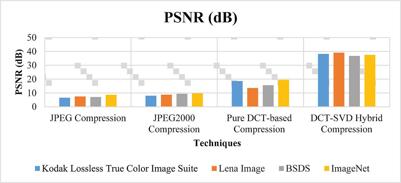 To evaluate the efficacy of the DCT-SVD hybrid compression algorithm, a comparative analysis was conducted, whereby existing image compression techniques such as JPEG, JPEG2000, and pure DCT-based compression were considered for comparison. Figure 5 depicts the PSNR values attained by each technique in relation to different test image datasets.