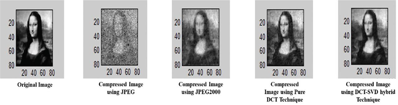 Visual comparison of original and compressed images for different techniques. DCT, discrete cosine transform; SVD, singular value decomposition.