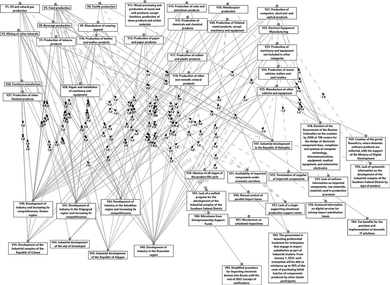 Figure 1 shows the cognitive map G0 of the development of the industrial complex of the Southern Federal District, which is a result of the first stage of cognitive modeling – collecting information, determining the entities and trends in the development of economic integration, systematization of theoretical and conceptual provisions, analysis of the main properties and features, and development of a cognitive model of the system (determination of vertices, relationships between them, weight coefficients, functional dependencies). Due to the lack of reference cognitive models of industry in the Southern Federal District, it is not possible to compare it with the standard.
