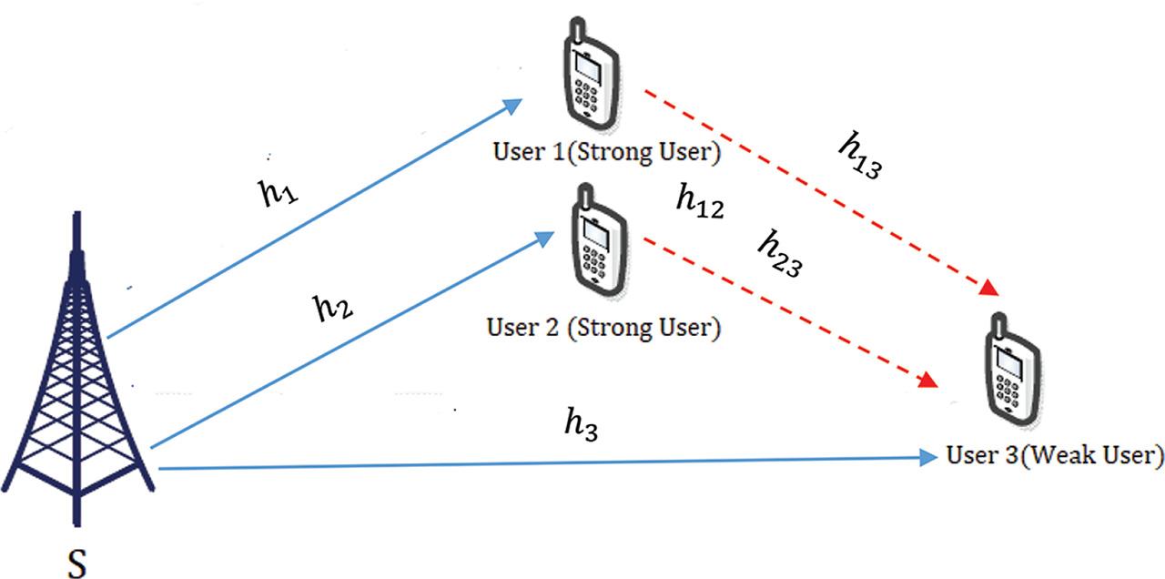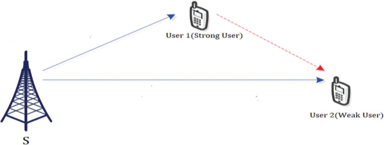 A relay broadcast channel (RBC) for single-antenna users is used. One user denoted as user 1 is the strong user; it has a stronger link or better channel conditions; the other user, denoted as user 2, is a weak user having poor channel conditions with the transmitter. The transmitter encodes an intended signal for these users depending upon their channel conditions – or in other words, different power allocation proportions are used for each user. More power is allocated to a weak user as compared to a strong user, which implies that the signal of the weak user has a high signal-to-noise ratio (SNR). Due to this, user 1 easily decodes user 2's signal even before decoding its own signal and can subtract it from total signal to retrieve its own signal, i.e., successive interference cancelation (SIC) is employed. The user's cooperation is used for improving the achievable rate of the weak user [19, 20].