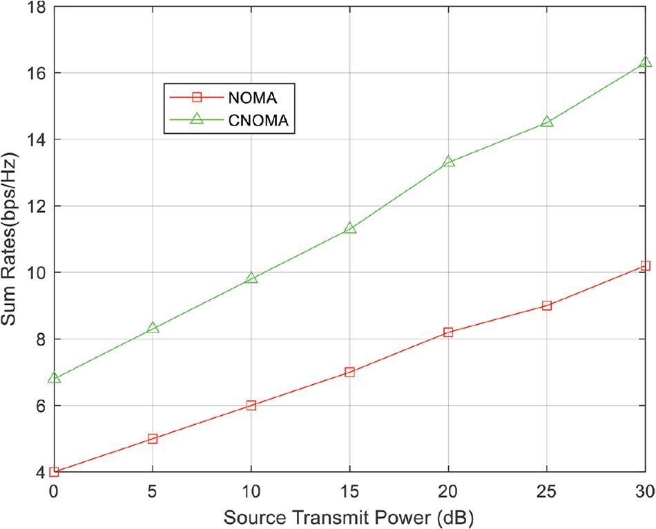 In Figure 3, the sum rate of the NOMA and CNOMA schemes is compared using various source transmit powers for three users’ scenario. The CNOMA is a clear winner in increasing the sum rates as compared to the traditional NOMA. As the SNR increases, the difference between NOMA and CNOMA increases too.