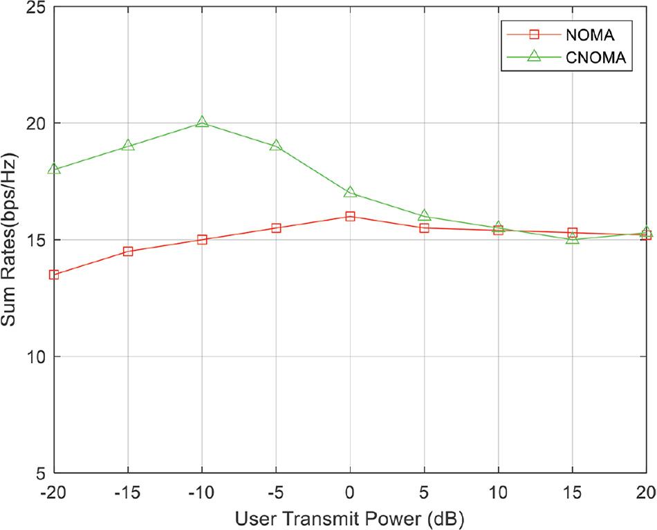 In Figure 4, the user's transmit power impact on the sum rates is compared for NOMA and CNOMA, considering that two near users (1 and 2) have equal transmit powers in the presence of one far user (user 3). From Figure 4, it is clear that the sum rate of CNOMA decreases with user transmit power >–10, which is due the fact that user 3's sum rate depends on the links with users 1 and 2 and also due to inter-user interference (IUI), which increases as a result of an increase in the user's power. When transmit power is >0, the sum rate stabilizes as the power of a near user or the direct link user becomes easily decodable.