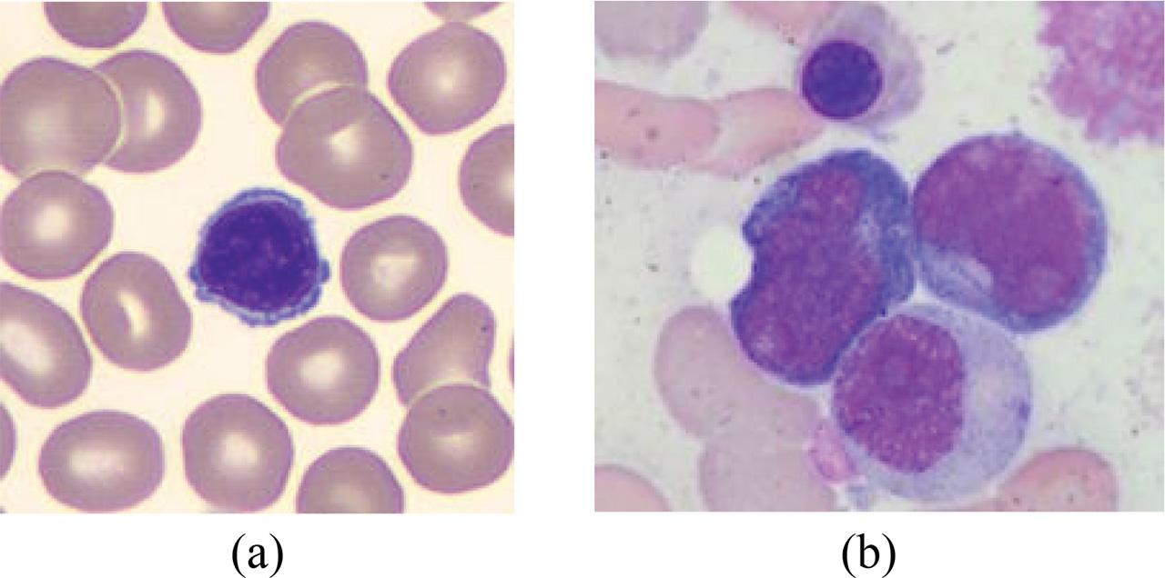 Images from the real-image dataset: (a) CLL, (b) CML, and (c) AML. AML, acute myeloid leukemia; CLL, chronic lymphocytic leukemia; CML, chronic myeloid leukemia.