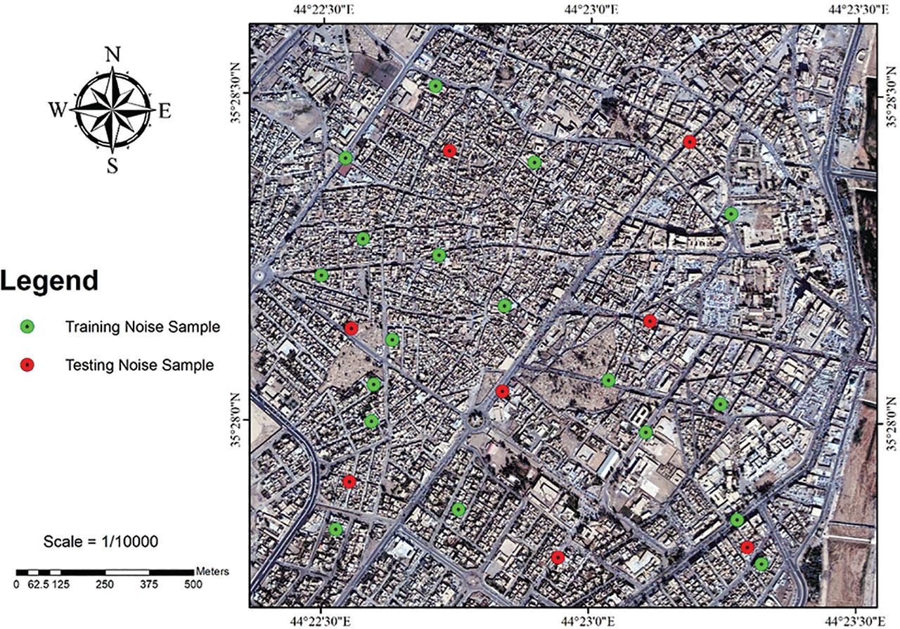 In this study, two models were built for traffic noise: (i) 2D traffic noise and (ii) 3D traffic noise. In each model, the prediction of the traffic noise was based on three methods namely, ANN, RF, and SVM algorithms. These methods are used in Python for predicting Leq,20 min. These applications in different soft computing approaches are used to find the best noise prediction map of Leq,20 for the capital of Kirkuk, Iraq. These methods are evaluated based on correlation (R), correlation coefficient (R2), and RMSE. Moreover, the correlation and variance inflation factor (VIF) of the model parameters were calculated and validated to get the best model. Finally, after the identification of the best model through validation from training and testing data, the Leq,20 maps are produced using GIS techniques for the study area.