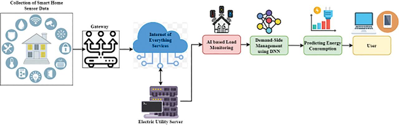 Figure 1 shows the proposed AI-IoES model. The research novelty is incorporating smart and non-smart electrical devices into the IoT spaces by manipulating an IoT device as an intermediate between the smart internet-linked side and all other devices controlled over the Internet. The combination of AI and IoE services in smart home energy management contains identifying and categorizing device on/off conditions by measuring electrical signal only at one position of the inhabited user. Smart home appliance energy data are initially collected using IoT sensors [32]. Six sensors, including a water flow sensor, a motion sensor, an energy control sensors, gas sensors, temperature sensors, and a sound sensor, monitor the house’s data and events and relay them to a synchronized gateway. Connecting to an IoT gateways or edge device enables IoT devices to combine their sensor data and either send it to the cloud for analysis or retain it locally. Status data is the most fundamental data on a system’s or device’s current state. Data for the IoT is generated by automated appliances and infrastructure, such as smart thermostats and lights. Data acquired by sensors may be stored in one of three places: at the sensor node where it was gathered (local storage), at a remote data center (external storage), or at another node within the same sensor network (in-network storage). Then, IoES-based smart home energy management requests home data from each sensor provider to guarantee interior comfort and give energy-saving suggestions based on individual user preferences. Using the information gathered, IoES-based SHEMS can detect and respond to (1) the energy consumption pattern, (2) issues with the normal operation of the home, like gas or water leaks and electrical failure (which may enhance energy depletion), and (3) emergencies that compromise the security and integrity of the home (e.g., burglary attempt, flood, fire). After alerting the user, the system displays the most essential details about each service provider (such as their names, addresses, phone numbers, hours of operation, costs, and user references). Energy networks may be optimized with the aid of AI by controlling the energy flow to and from the house, industry, battery, renewable energy source, microgrids, and the main power grids. The outcome is less energy wasted while more people pay attention to energy use. The term DSM is utilized to describe programs and tools aimed at influencing domestic customers to reduce their energy use. DSM involves implementing strategies and programs to actively manage and adjust electricity consumption patterns on the consumer side. This includes initiatives such as load shifting, EE measures, and DE programs that help optimize energy usage and reduce peak demand on the grid. One possible advantage of DSM utilizing DNN is that customers may save money on their monthly power bills by modifying when and how much energy they use. There are essentially four main types of DSM. There are four efficient approaches to DSM and DE: DE is actively managing electricity consumption during high demand or supply constraints, incentivizing consumers to curtail or shift their usage to reduce peak demand on the grid, lower overall electricity costs, and enhance grid stability, EE was maximizing output from a given energy input while minimizing waste and inefficiencies by adopting technologies, practices, and policies that reduce energy consumption, lower utility bills, mitigate environmental impacts, and enhance energy security, virtual power plants (VPP) also called as distributed energy resource (DER) systems that integrate multiple decentralized energy assets into a single, coordinated VPP, optimizing their collective operation and providing grid services such as peak shaving, frequency regulation, and grid balancing, and spinning reserve (SR) is the portion of generating capacity that is online and synchronized with the grid but not currently engaged in producing electricity, acting as a rapid-response backup reserve that can be immediately dispatched to ensure grid stability and reliability during periods of high demand or system disturbances. Remote energy management solution enables monitoring, managing, analyzing, and control multi-location energy operations. Through the Internet, mobile phones, etc., users may actualize prepaid services and remote monitoring of household equipment. The DNN is an extensively utilized technique for predicting time series. RNNs are commonly used in DNNs to predict time series data. A specific type of RNN, known as LSTM networks, is particularly effective in capturing temporal dependencies and patterns in sequential data. This makes them ideal for performing time series prediction tasks. Depending on the weather or period data, the DNN will recognize patterns and understand during which days the smart home electricity demand is the highest or how much energy can be generated in a particular season.