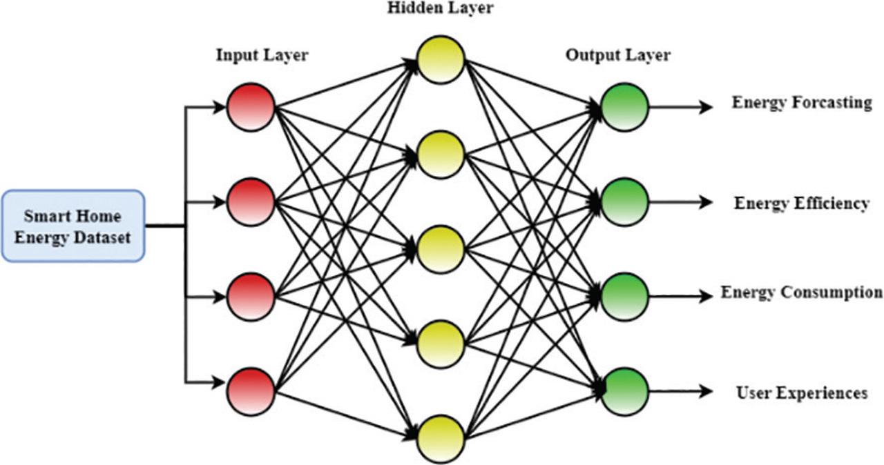 Figure 2 illustrates the DNN model. The time series data used in this research have been collected from the dataset [32]. The DNN designs all include one or more hidden layers learned via backpropagation and gradient descent. This research finds that when additional hidden layers are added to DNN models, the ensuing abstract features lead to over-fitting issues. In DNN-based electrical load forecasting system for effective resource management, the design of the prediction model will substantially affect DNN performance, which is very problem-dependent. DNN-based energy prediction models adapt to changes in user behavior, appliance usage, and external factors such as weather conditions and occupancy levels through continuous learning, feature engineering, temporal context, dynamic input feeding, ensemble learning, and transfer learning techniques. This research suggests DNN-based load forecasting models using an empirical load database from the demand side. DNN load forecasting models capture energy consumption patterns using preprocessed data types, such as historical load data, weather data, calendar and time features, historical load patterns, exogenous factors, feature engineering, and data splitting. Preprocessing involves cleaning, normalizing, scaling, imputing, interpolating, and encoding the data. The data are split into training, validation, and test sets while preserving temporal order. The models predict future load demand accurately and reliably. Predictive analytics is essential for managing energy consumption in AI-enabled home automation systems. It enables homeowners to forecast energy demand accurately, optimize usage in real-time, and engage in energy-saving practices. By analyzing historical data and user interactions, the system suggests actionable insights and strategies for optimizing energy consumption, leading to greater efficiency, cost savings, and sustainability in the home. Several factors, including the neurons, the number of hidden layers, activation functions in every hidden layer, and the learning algorithm, are crucial for the suggested method’s effectiveness. A DNN is a highly nonlinear function, a trainable approximator of forms x(·): RN → RN where N and M are the dimensionality of input and output space. Operationally, DNNs contain input, output, and hidden layers. The input layers receive the DNN’s input vectors y. The neuron in any other layer receives, as its input, the weighted output of a neuron in previous layers. The weight of the DNNs makes up its weight parameters, denoted as θ. For ease, this study considers DNN with scalar output so that x(·): RN → R. The original outputs of the DNNs are denoted as x(x|θ), neurons in output layers.