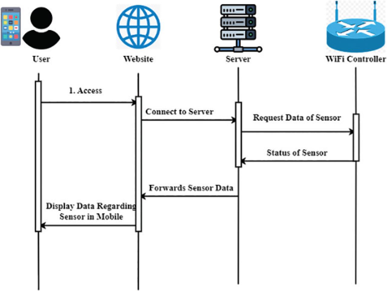 Figure 3 displays the sequence diagram of the IoE-based smart home energy monitoring system. Using an intuitive web-based interface, it is possible to automate the management of a household’s energy-consuming equipment from anywhere in the world. This method reduces all the manual work that normally goes into maintaining an appliance in the home. The information gathered by the sensors will be uploaded to the cloud through a Wi-Fi controller. No human intervention is required since all data from the cloud will be shown on the website, and all decisions will be made in the cloud. Data collected by edge devices, such as sensor readings and user profiles, may be warehoused in a highly scalable storage server. It can process the Big Data created by homes and expand to accommodate other neighborhoods. A fast and extensible database is necessary to monitor user details and user-home and home-device connections. An operational database was selected, one that can be operated on a scalable storage server. Web services developed using JavaScript allow the client application to communicate with the operational database. These functions move information to and from the database and deliver it back to the user. The client app uses web services for authentication, device monitoring and control, properties observing, device viewing, monthly bill viewing and payment, and graph viewing at the user’s level. The HTTPS protocol is used to develop online services to secure data transmission. The suggested AI-IoES enhances the user experience, EE, and accuracy ratio and reduces energy consumption compared with other existing methodologies