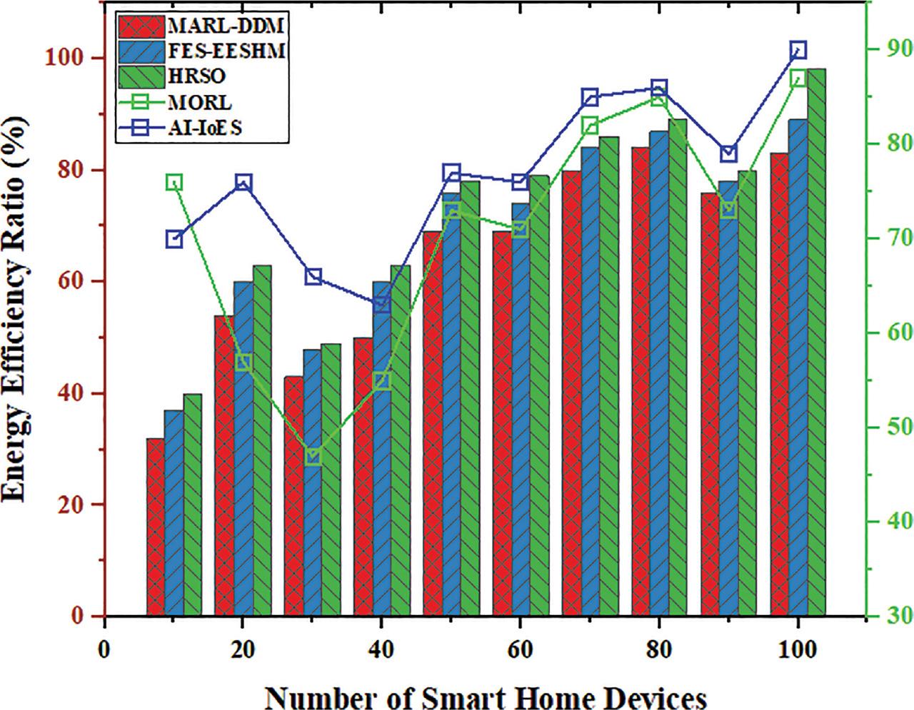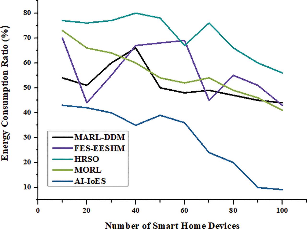 Energy consumption rate. AI-IoES, AI-enabled Internet of everything services; FES-EESHM, fuzzy expert systems efficient energy smart home management system; HRSO, hybrid robust-stochastic optimization; MARL-DDM, multi-agent reinforcement learning based data-driven methods; MORL, multi-objective reinforcement learning.
