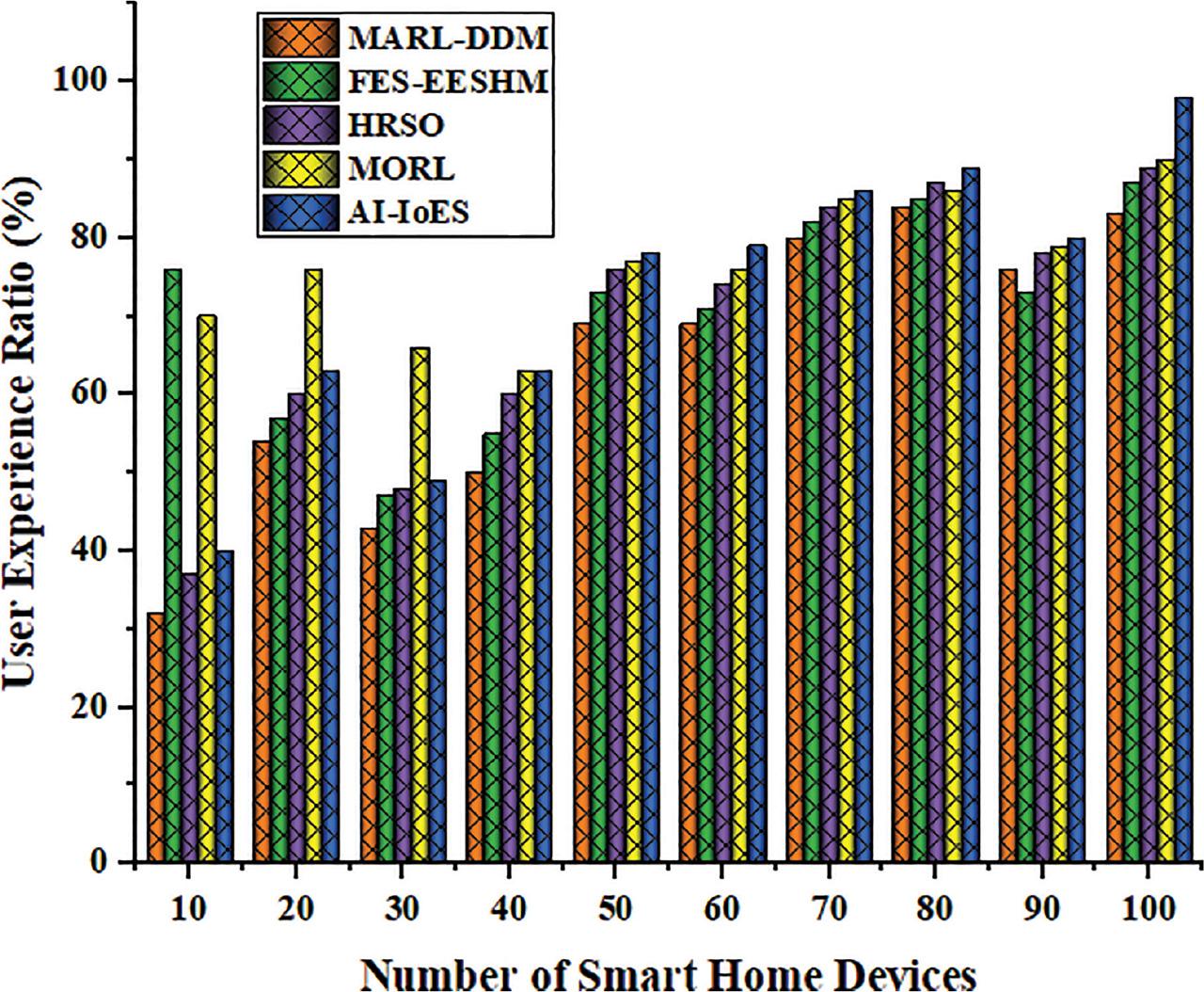 User experience ratio. AI-IoES, AI-enabled Internet of everything services; FES-EESHM, fuzzy expert systems efficient energy smart home management system; HRSO, hybrid robust-stochastic optimization; MARL-DDM, multi-agent reinforcement learning based data-driven methods; MORL, multi-objective reinforcement learning.