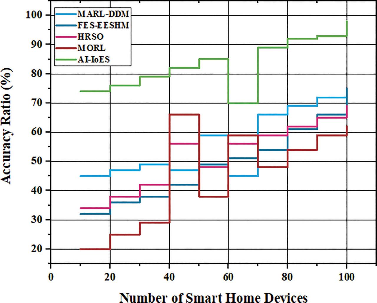 Accuracy ratio. AI-IoES, AI-enabled Internet of everything services; FES-EESHM, fuzzy expert systems efficient energy smart home management system; HRSO, hybrid robust-stochastic optimization; MARL-DDM, multi-agent reinforcement learning based data-driven methods; MORL, multi-objective reinforcement learning.