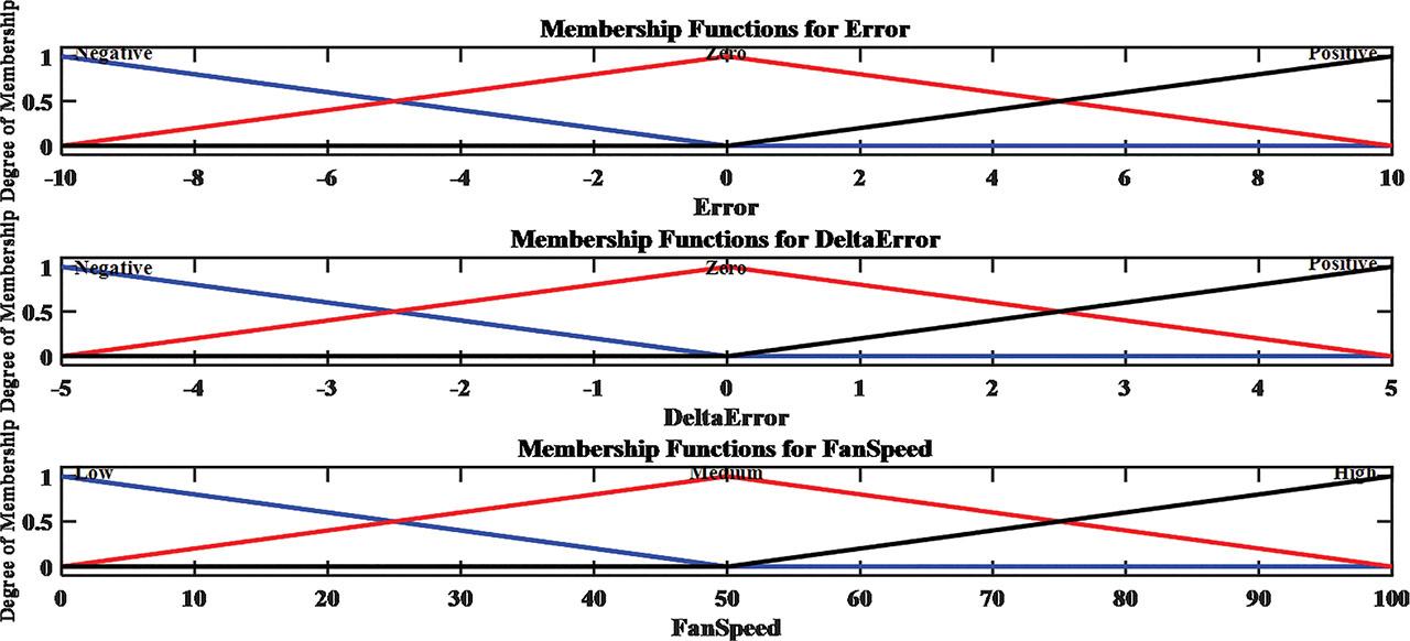 Similarly, the Delta Error variable is defined within the range [−5, 5] [−5, 5] [−5, 5] and also has the following three membership functions: Negative, Zero, and Positive.