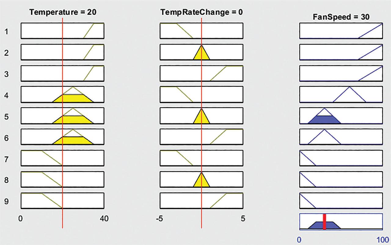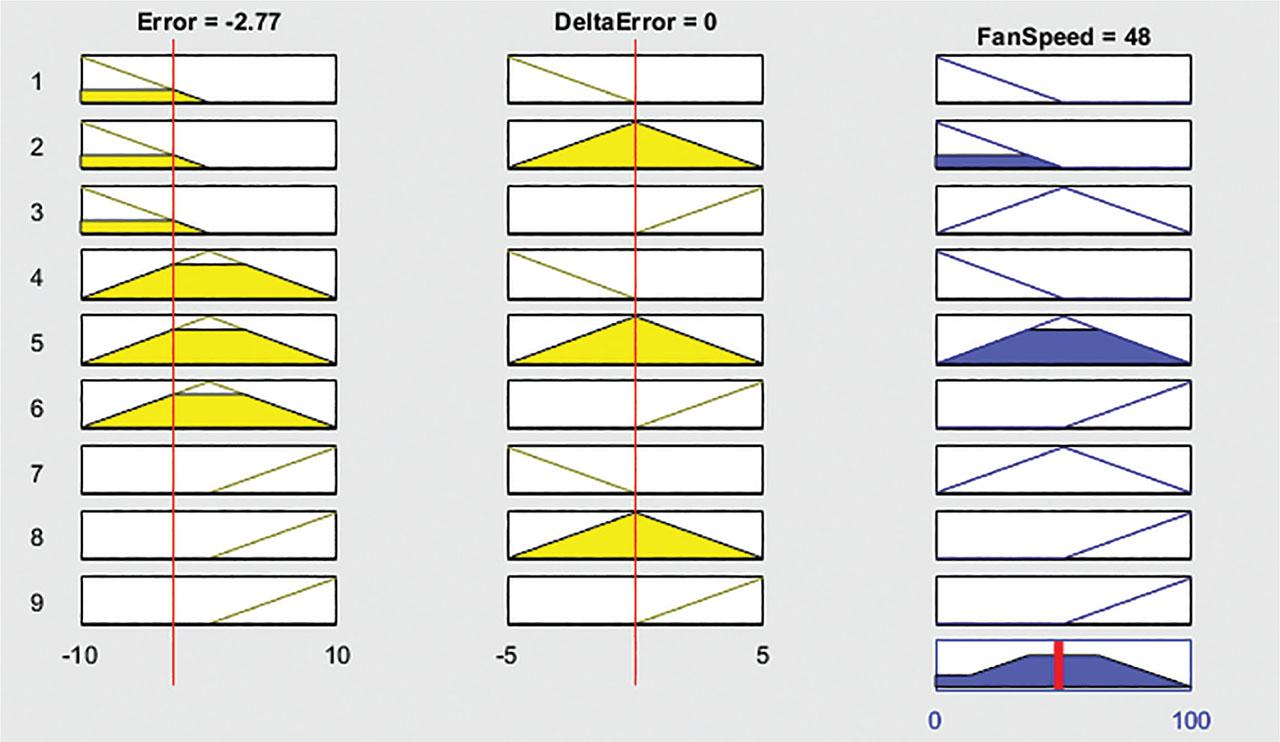 These rules modulate the fan speed based on the temperature and its rate of change. Higher fan speeds are used in high-temperature conditions to enhance cooling, while the fan is turned off in low-temperature conditions to conserve energy and avoid unnecessary cooling. This ensures efficient and responsive control of the cooling system. The following are the six rules of those nine rules.